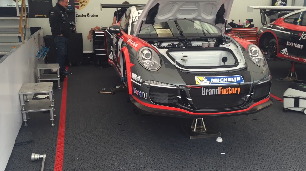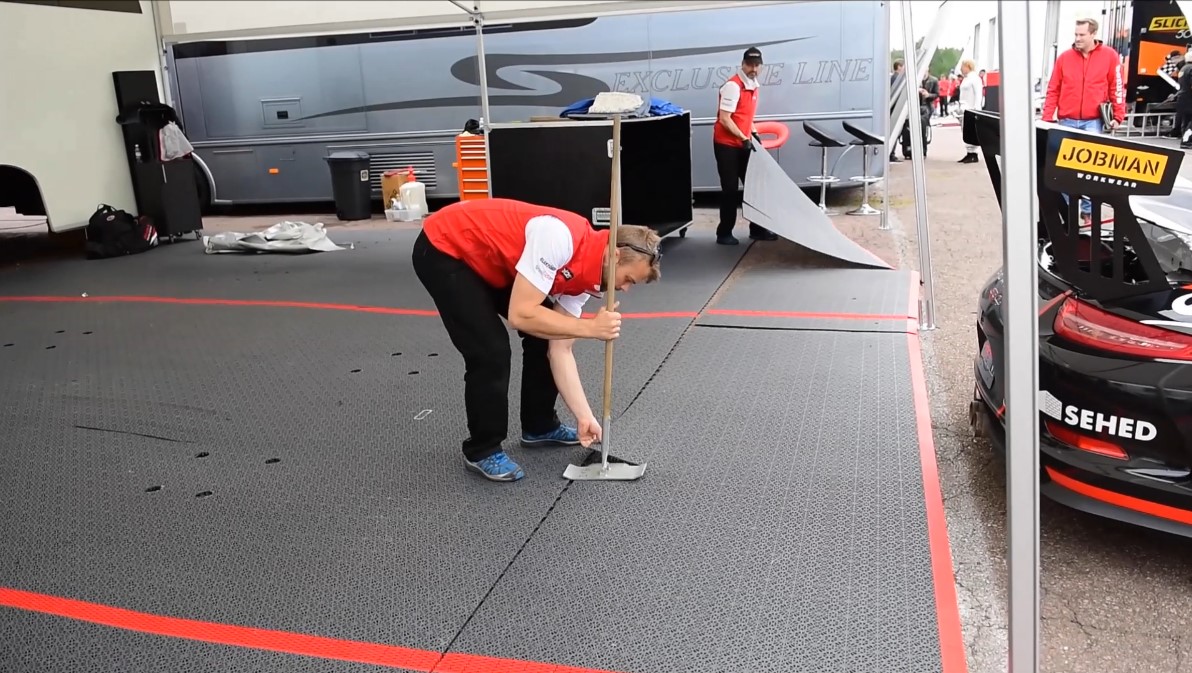 In a racing tent, it's hectic! Quick repairs and analyses take place there. It's then important to work in an environment that is dry and comfortable. With Bergo Floors, you get a dry surface to work on that also drains away rain and insulates from the often cold asphalt.
